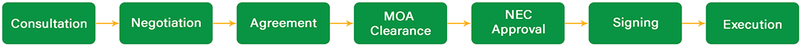 The MOA discussions are guided by a charter and schedule developed by the parties. The agreed in principle MOA in processed through the established government process for clearance. Once NEC approves the MOA, the parties execute the MOA for signing and implementation.
